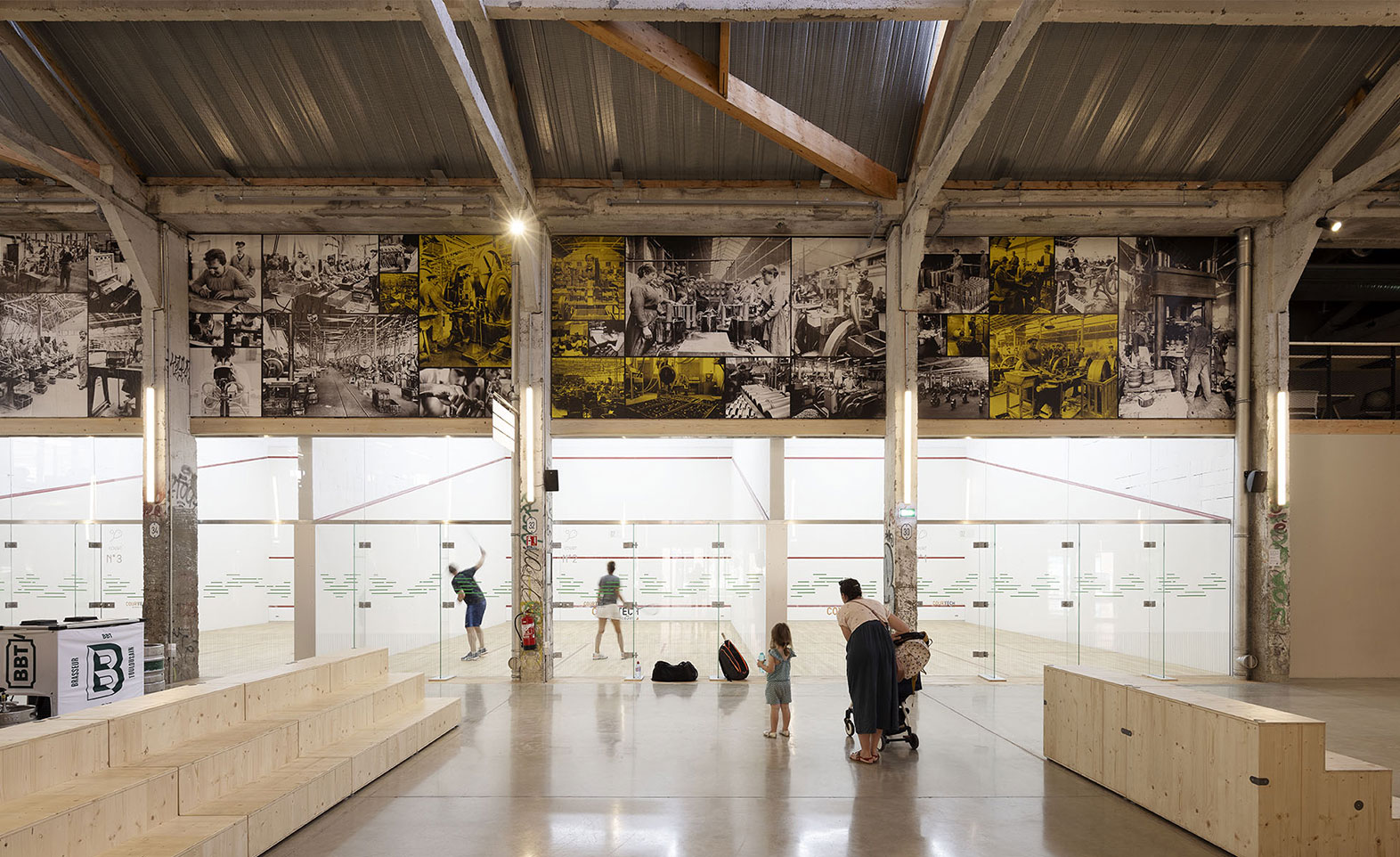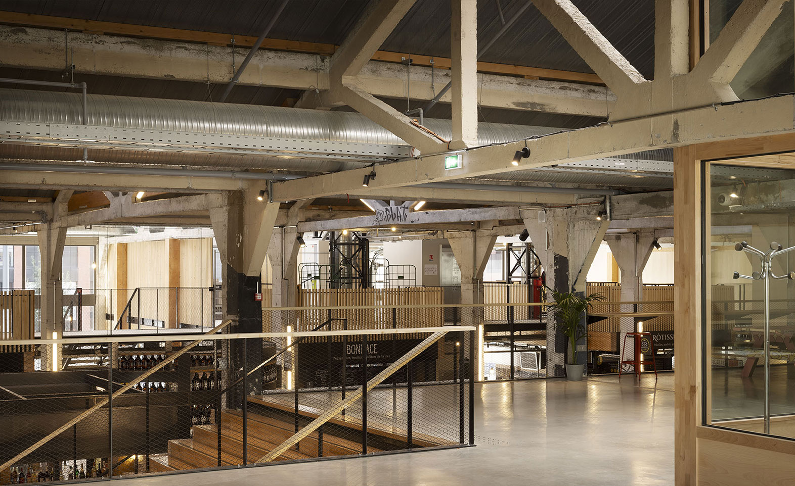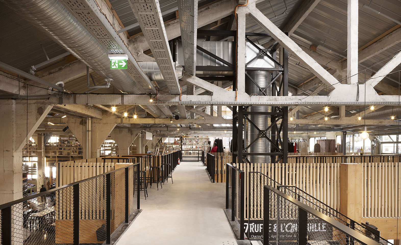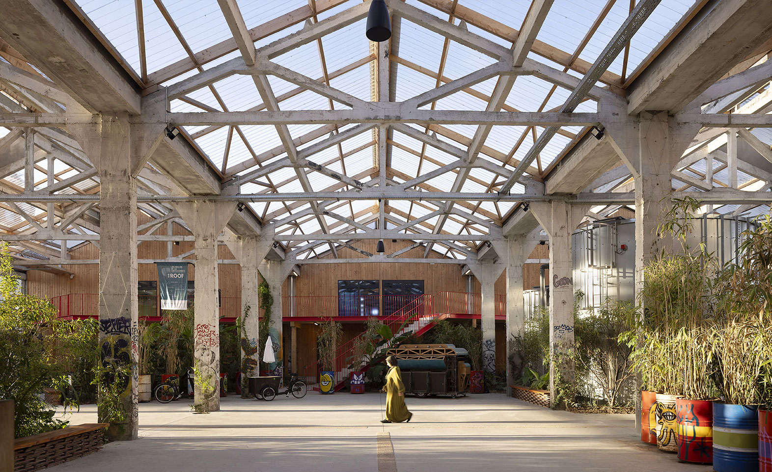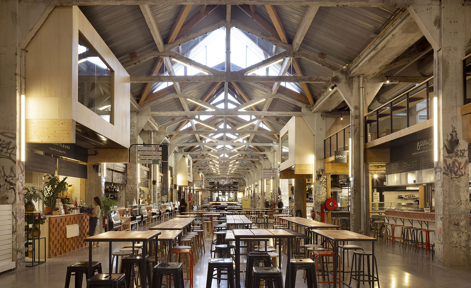 Long de 190 mètres, le bâtiment des Halles a été scindé en quatre espaces distincts : la halle nord (7 500 m²) qui héberge les stands de restauration, des espaces de coworking et salles de réunion, des activités sportives (squash, fitness), un espace pour des activités socioculturelles, une salle de danse, une école de formation audiovisuelle et une librairie ; la halle verte (1 200 m²) à la fois lieu urbain et jardin suspendu couvert, poumon central de l’ensemble ; la halle sud (2 000 m²) avec la salle d’escalade et des espaces pour les pratiques de mieux-être ; ainsi qu’une salle de spectacle d’une capacité de 860 places.